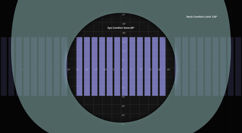 This grid guideline taken from Google VR Sticker sheet can be used on either frame size 1920x1080px or 2304x1296px as the 2 most common VR screen resolutions. This suggests that the main UI content should be placed in the Eye Comfort Zone area, and no content should be put out of the Neck Comfort Limit as it is invisible to the users.
