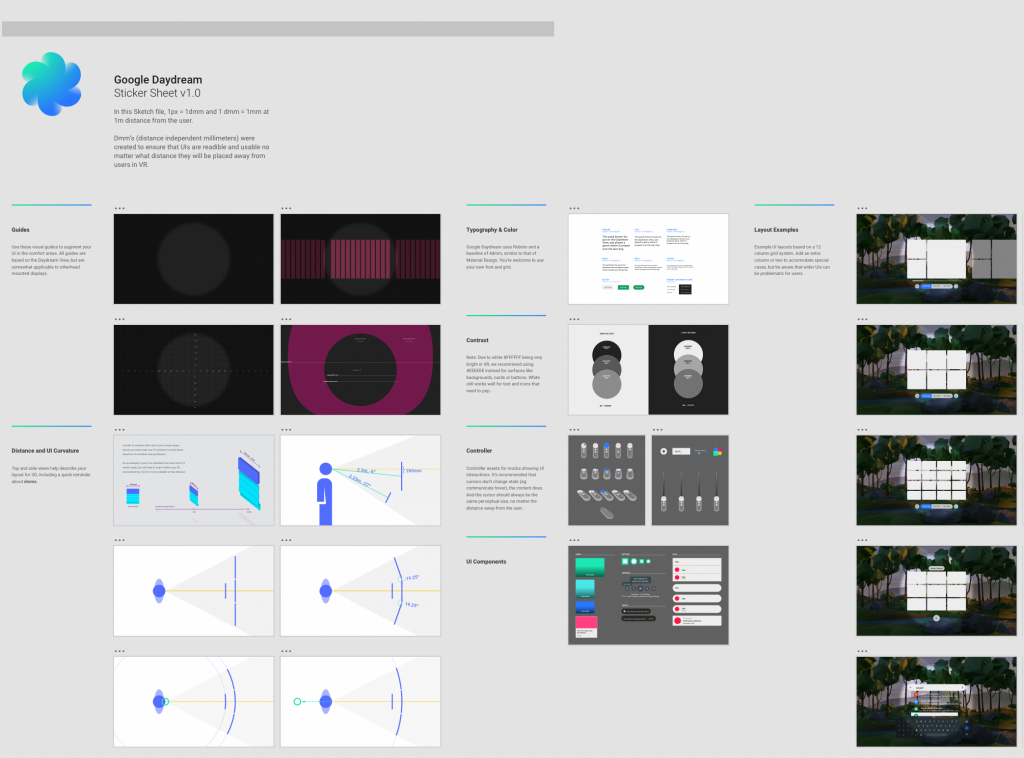 Google VR Sticker sheet was introduced during Google I/O ’17 as a part of the guidelines on how to design screen interfaces for VR. This Sketch file offers a variety of VR UI components and serves as a valuable resource for comprehending spatial relationships, distances, and sizes within virtual reality, allows us to scale the UI from Figma or Sketch to other game engines.