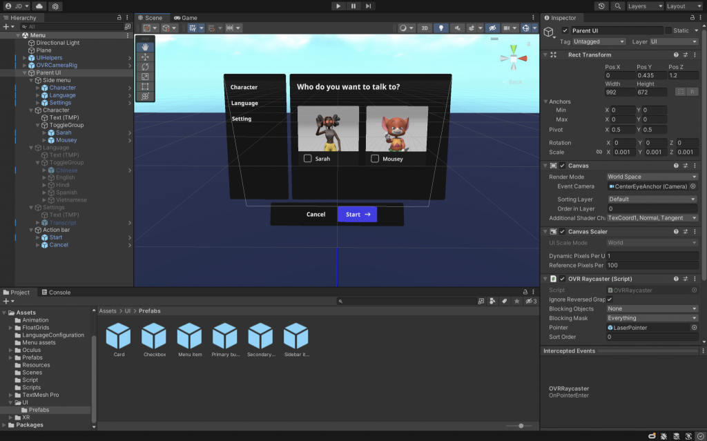 VR Language Learning is a VR application that uses the latest generative AI language models (particularly ChatGPT) to enable users to practice oral conversations in a more flexible way. As a product designer, my role was to build an interactive interface for the application using Unity 3D.