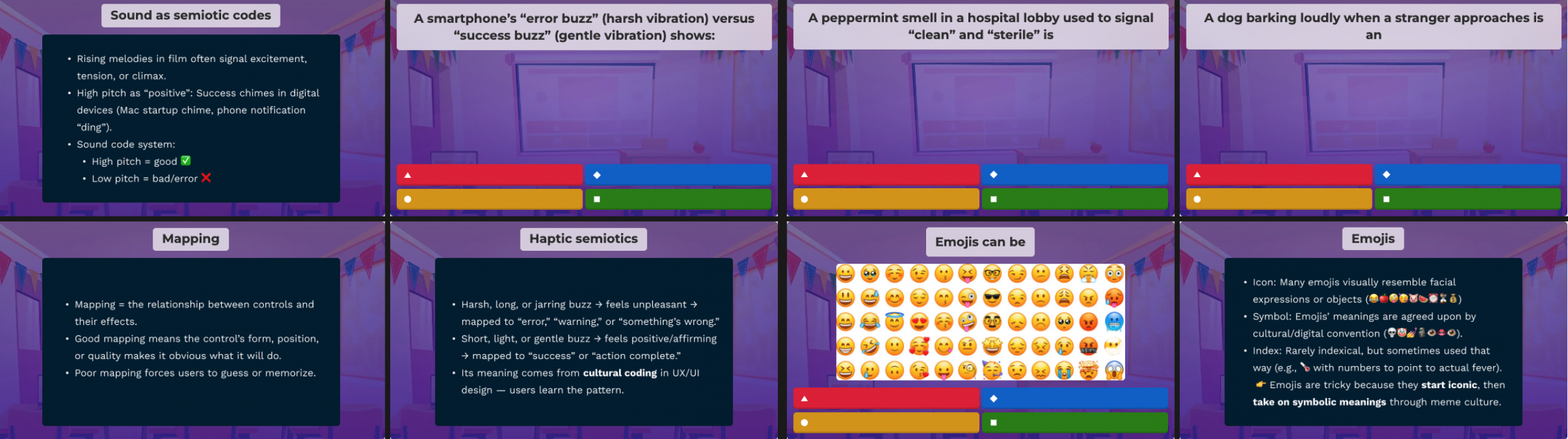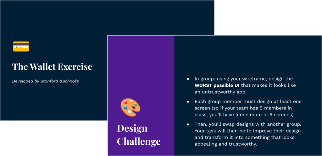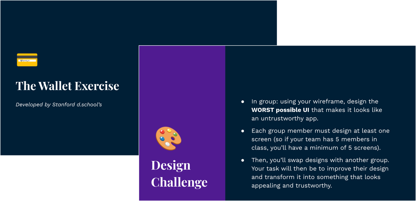 I focused on a studio-based classroom where hands-on activities drive class time. Each session centers on an interactive exercise, with students receiving feedback from peers and the instructional team. Examples include the Wallet Exercise (from Stanford d.school) to practice prototyping and projects like designing a trustworthy visual interface.